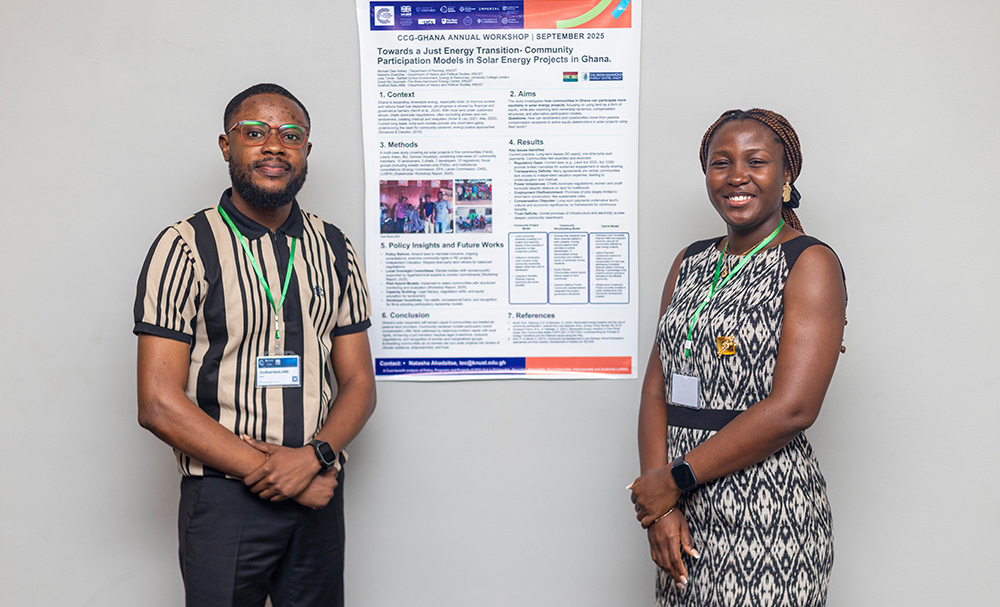 Natashie Ahadzie, a research assistant at the Brew-Hammond Energy Centre, presented her team’s work on “Towards a Just Energy Transition: Community Participation Models in Solar Energy.” She explained that the study set out to examine how landowners in Ghana could use their lands as equity in solar energy projects.
